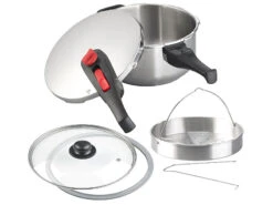 Rosenstein & Söhne Dampf-Koch-Topf:Edelstahl-Schnellkochtopf Mit Dampfgar-Einsatz, Bis 90 KPa, 4 L