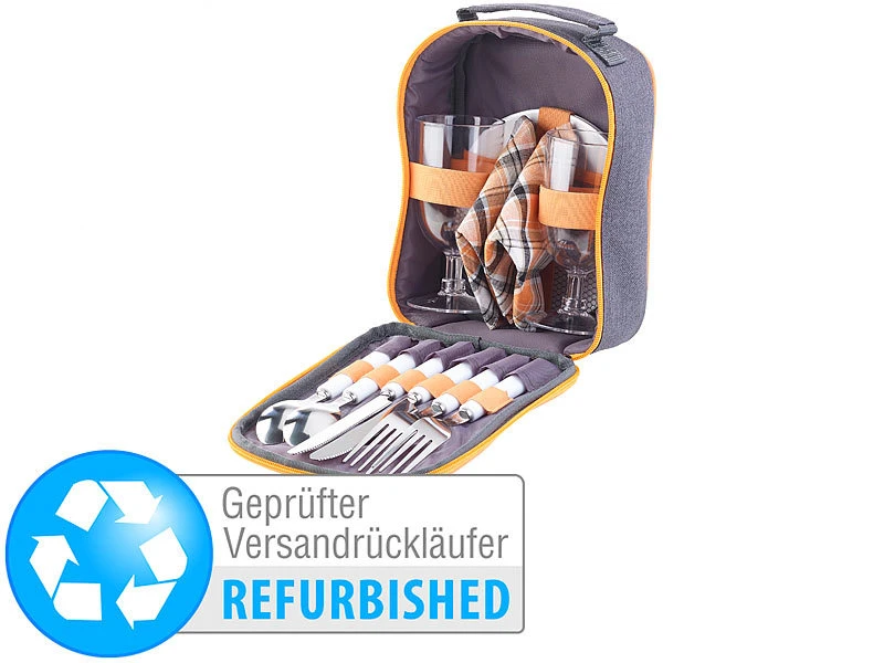 Jetzt haben Sie alles dabei für den nächsten Ausflug ins Grüne! Die handliche Tasche enthält Teller, Besteck, Weingläser und Servietten für 2 Personen. Nur für Getränke und Snacks müssen Sie noch selber sorgen.