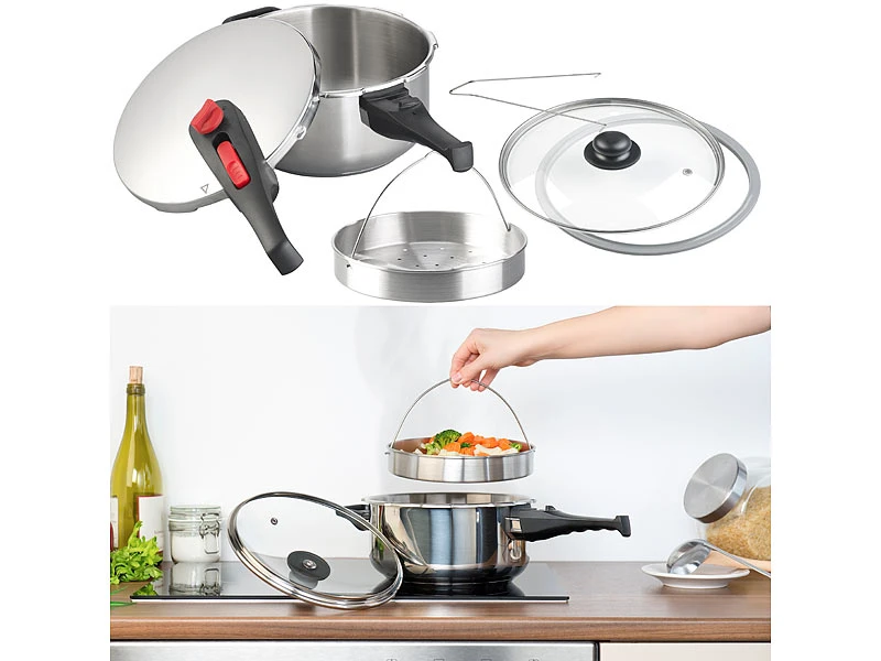 - Schnellkochtopf inklusive Deckel, Dichtungsring, Glas-Deckel mit Silikon-Ring, Sieb-Einsatz, Ständer und deutscher Anleitung