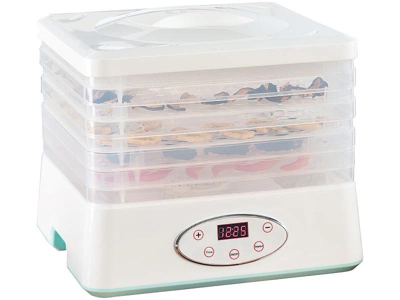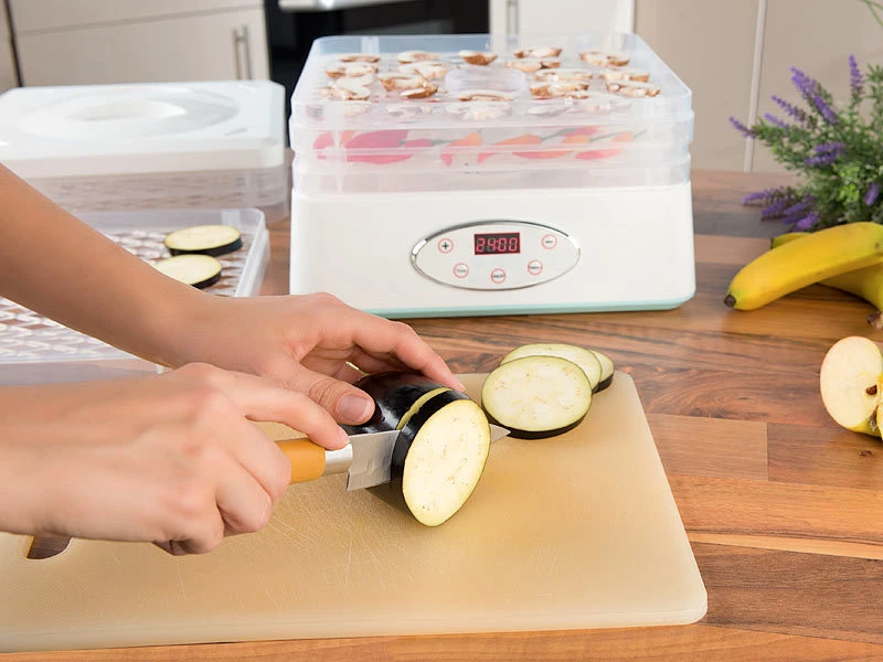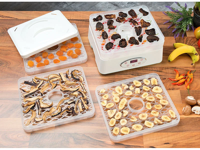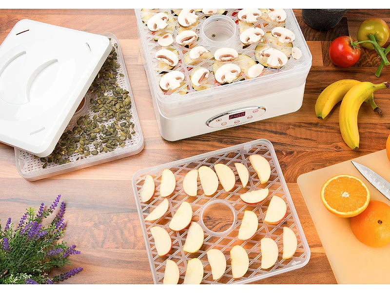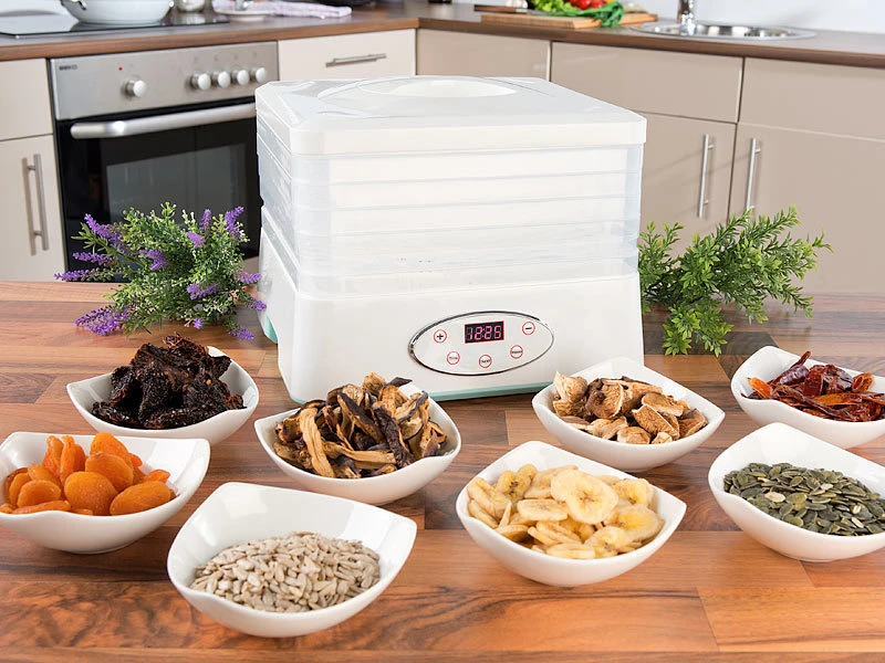 Konservieren Sie Essen: aber ganz ohne Konservierungsmittel! Ihr neuer Dörrautomat entzieht Nahrungsmitteln schonend ihre Flüssigkeit. Das hemmt die Bildung von schädlichen Keimen und Bakterien. Ihr Essen wird so haltbar und bleibt lange schmackhaft. Es bleiben sogar wertvolle Vitamine sowie Nährstoffe erhalten!