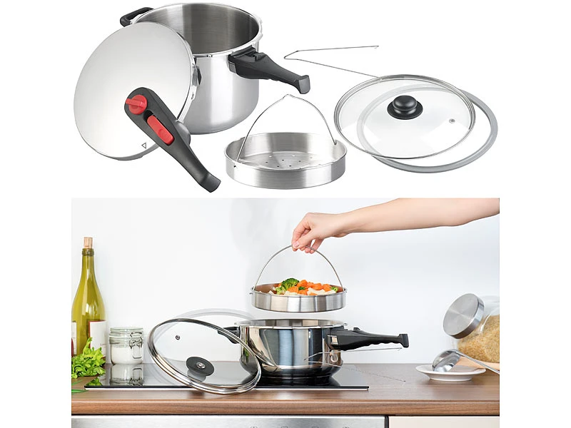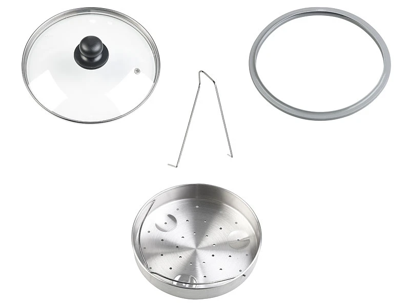 - Schnellkochtopf inklusive Deckel, Dichtungsring, Glas-Deckel mit Silikon-Ring, Sieb-Einsatz, Ständer und deutscher Anleitung