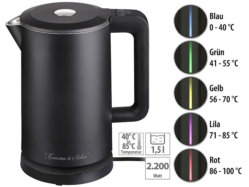 Hingucker in Ihrer Küche: Mit seinem modernen Aussehen passt der doppelwandige Wasserkocher stilsicher in jede Küche und auf den gedeckten Tisch. Dank wärmeisoliertem Gehäuse aus BPA-freiem Kunststoff ist die Oberfläche des Wasserkochers auch während des Kochvorgangs jederzeit berührbar. Das Innenleben ist plastikfrei verarbeitet und besteht aus Edelstahl. Der Clou: Die LED-Beleuchtung wechselt je nach Wassertemperatur die Farbe! So wissen Sie jeder Zeit, wie heiß das Wasser gerade ist.