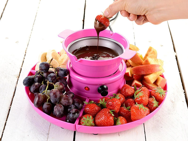 Ideal für den Kinder-Geburtstag: Das leckere Schoko-Fondue mit Marshmallows, Obst oder Gebäck. Der besondere Tipp für die Feier: Schmelzen Sie Marshmallows und bestreichen Sie damit knusprige Kekse. Oder gießen Sie Ihren eigenen Eiswürfel-Zoo!