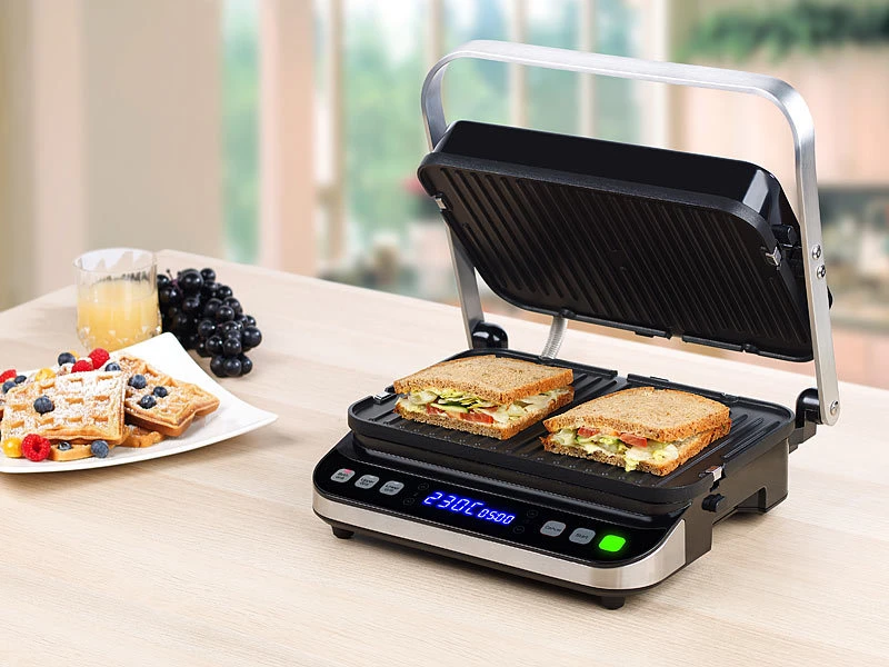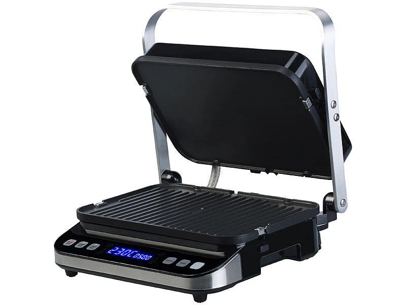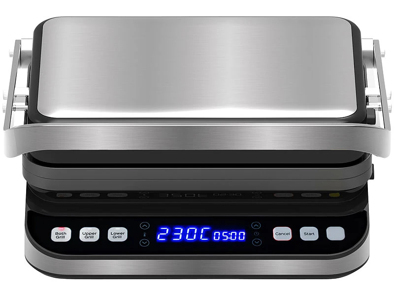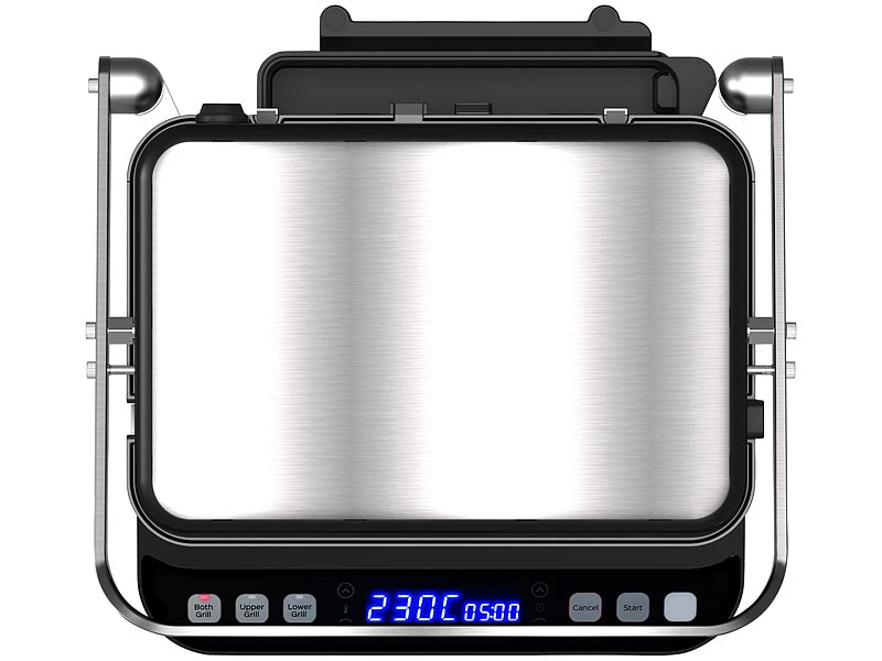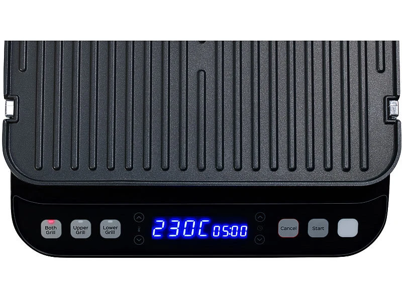 - Separat steuerbare Grillflächen: untere Grillplatte, obere Grillplatte, beide Grillplatten