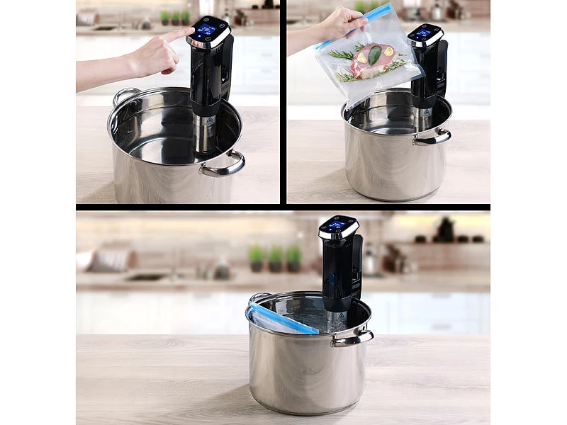 Garen Sie Fleisch, Fisch und Gemüse schonend wie ein Profi – unter Vakuum! Rindfleisch, Lamm oder frisches Gemüse geben Sie im Vakuumbeutel einfach ins Wasserbad. An Ihrem Sous-Vide-Garer stellen Sie dann präzise die gewünschte Temperatur und Garzeit ein – schon sorgt Ihr neues Küchen-Genie für eine perfekte Zubereitung bei gleichmäßiger Temperatur.